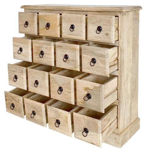 Ta wyjątkowa komoda została wykonana w małej, rodzinnej stolarni w Indiach. Komoda posiada aż szesnaście szufladek, do których przymocowano czarne, metalowe uchwyty rustykalne, ułatwiające otwieranie i są jednocześnie ozdobą. Komoda idealnie sprawdzi się jako mebel na drobiazgi i domowe skarby lub posłużyć może jako bieliźniarka dla osób, którą wyjątkową wagę przywiązują to segregacji i uporządkowania.