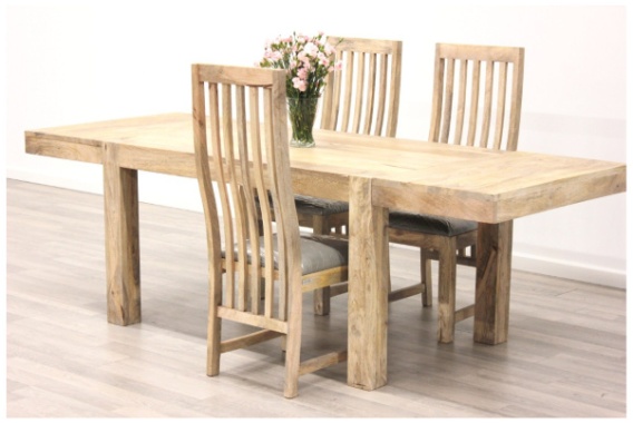 Mebel o neutralnym, ponadczasowym wyglądzie. Cechuje go prosta, stabilna i solidna konstrukcja. Stół wykonany z wyselekcjonowanego, egzotycznego drewna mangowca indyjskiego, w naturalnym odcieniu, którego piękno wydobyto dzięki zastosowaniu tradycyjnych indyjskich technik stolarskich. Blat stołu wykonany z długiej litej deski o grubości 3 cm. Stół pomalowany ekologicznym, akrylowym lakierem matowym.