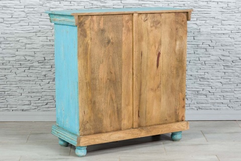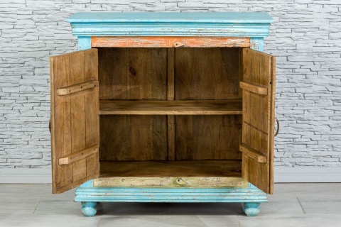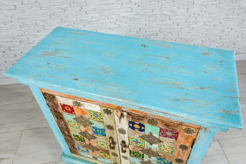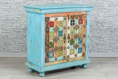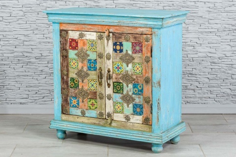 Kolorowa komoda indyjska zdobiona kwadratowymi płytkami ceramicznymi i tłoczonymi okuciami mosiężnymi. Wykonana w małej, rodzinnej stolarni z drewna mango. Jest niezwykle oryginalna i jedyna w swoim rodzaju. Nie występuje drygi identyczny egzemplarz. Niebieski, przecierany korpus, przepięknie kontrastuje z multikolorowymi drzwiczkami w stylu orientalnym. Komoda posiada wewnątrz jedną półkę. Sprawdzi się w każdym pomieszczeniu.