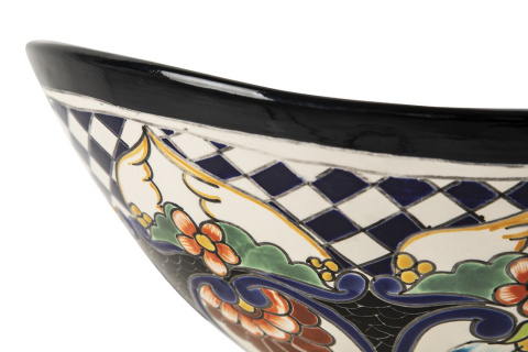 Piękna, ceramiczna, kolorowa umywalka nablatowa z Meksyku, w kształcie łódki, zdobiona wypukłymi wzorami z farby konturowej zarówno w środku jak i na zewnątrz. Ten oryginalny kształt, przypominający kadłub łódki, pozwala oglądać wzór z każdej strony. Wszystkie umywalki są malowane ręcznie przez meksykańskiego artystę, więc każda umywalka stanowi unikalne dzieło sztuki użytkowej.