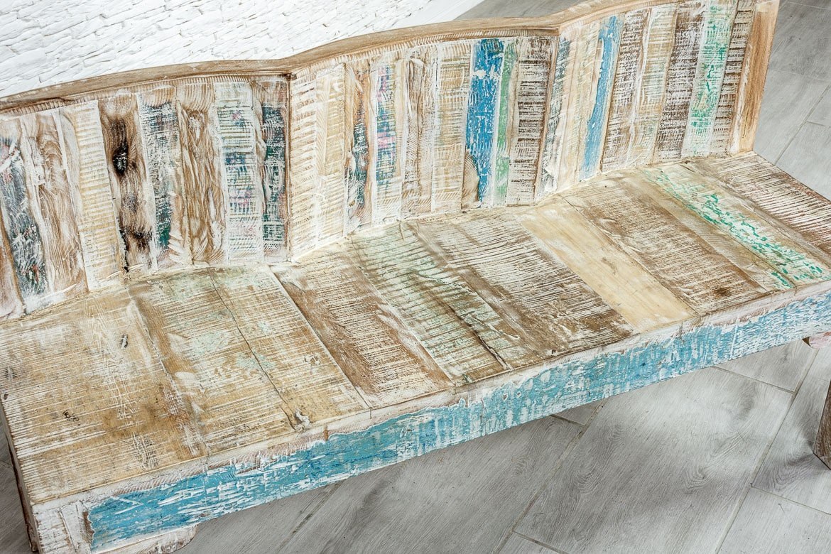 Trzyosobowa, przecierana ławka indyjska wykonana z drewna recyklingowego. Wybarwiona na odcienie bieli, niebieskości i zieleni w połączeniu z naturalnym kolorem drewna. Oparcie posiada trzy wgłębienia zwiększające komfort siedzenia. Mebel idealnie sprawdzi się w kuchni, jadalni lub na zadaszonym tarasie. Siedzisko znajduje się na wysokości 54cm.