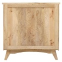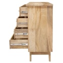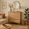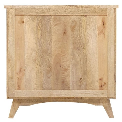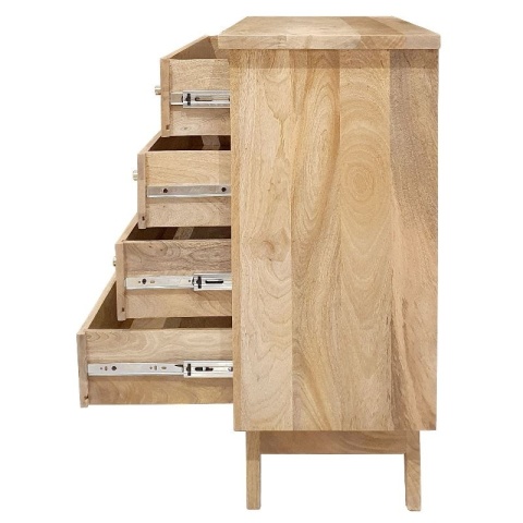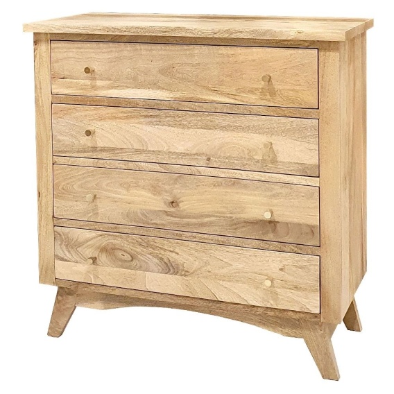 Jasna komoda na nóżkach z szufladami, wykonana z litego drewna mango.