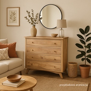 Ta mała komoda doskonale sprawdzi się w przedpokoju, salonie, sypialni czy nawet biurze. Dzięki swoim wymiarom pomieści wiele rzeczy, które chcesz mieć zawsze pod ręką. Mebel posiada cztery szuflady z uchwytami umożliwiającymi otwieranie.