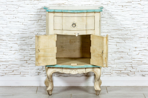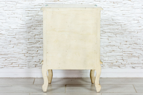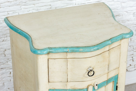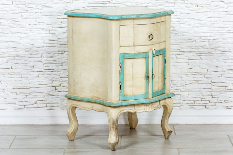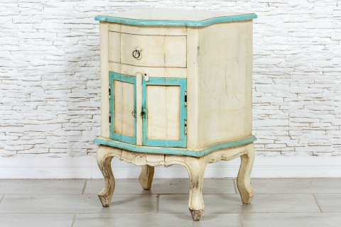 Indyjska, postarzana szafka nocna na giętych nóżkach, stylizowanych na styl Ludwika XVI. Tę piękną szafkę wykonano z drewna mango i wybarwiono na odcień antycznego kremu z miętowymi wstawkami. Liczne przetarcia są efektem zamierzonym. Oprócz dość dużego schowka szafka posiada również małą szufladkę na drobiazgi.