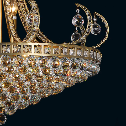 Żyrandol wykonano ze szkła przezroczystego i metalu w kolorze złota. Jest niezwykle dekoracyjny i ciężko przejść obok niego obojętnie. Kuliste kryształy zamocowane na ozdobnej, metalowej obręczy przepięknie mienią się i połyskują w zależności od pory dnia i rodzaju światła. Strojne zwieńczenie dodaje mu jeszcze więcej wytworności. Ten luksusowy żyrandol zaczaruje każdą przestrzeń.