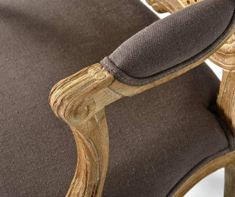 Stelaż wykonany z litego dębu bielonego i pokryty najwyżej klasy lnianą tapicerką. Przepiękny, klasyczny kształt inspirowany meblami z dawnych lat i stylem dworkowym, oddaje hołd ponadczasowej elegancji muśniętej współczesnością. Wygodne, miękkie siedzisko, wyprofilowane oparcie i komfortowe podłokietniki sprawiają, że krzesło jest bardzo wygodne. Szczotkowane, celowo postarzone drewno i rustykalne przetarcia zmiękczają archaiczny charakter mebla.