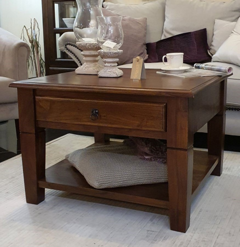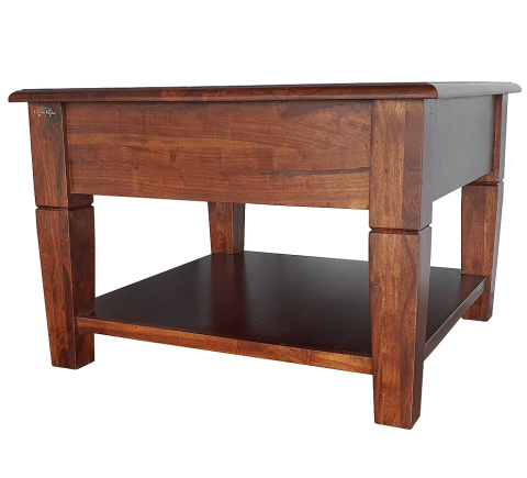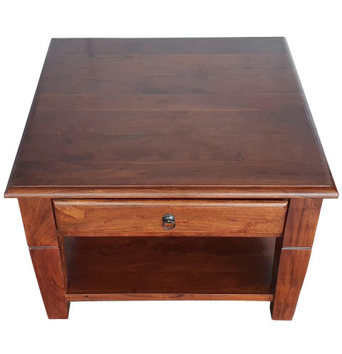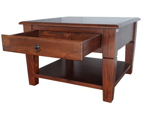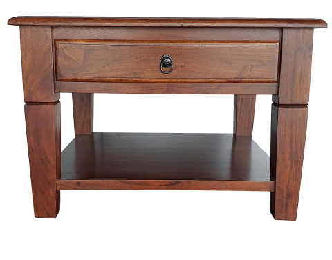 Stolik posiada szufladę z metalowym, ozdobnym uchwytem i dolną półkę. Mebel wykonany z bardzo wysokiej jakości egzotycznego drewna akacji indyjskiej o naturalnym usłojeniu, wybarwiony na odcień ciepłego brązu.