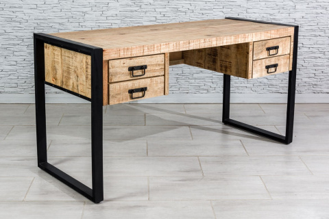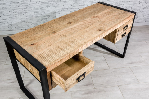 Drewniane, loftowe biurko indyjskie z czterema szufladami.