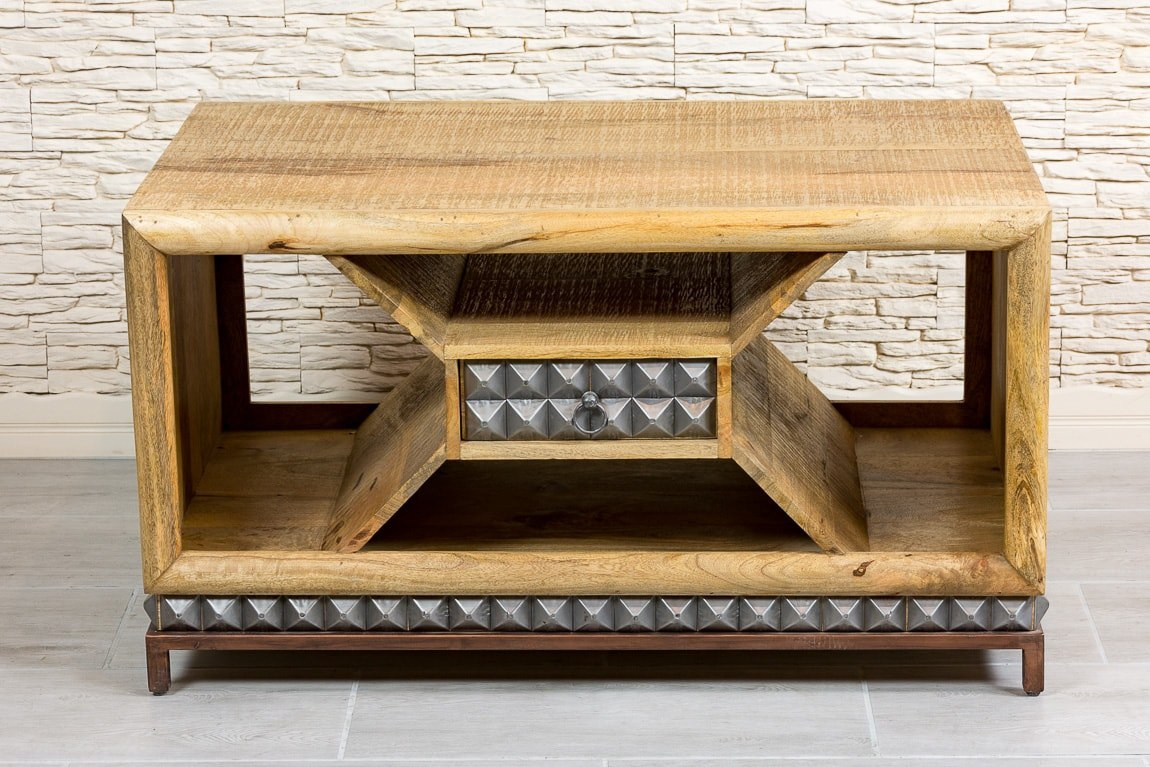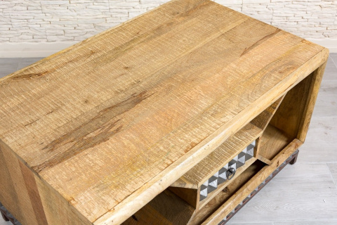 Indyjski, nowoczesny stolik w stylu loftowym, wykonany z niebarwionego mangowca indyjskiego - drewna o wysokich parametrach wytrzymałościowych. Naturalna struktura egzotycznego drewna w połączeniu ze stalowymi ozdobnikami, nadaje meblowi industrialnego charakteru.
