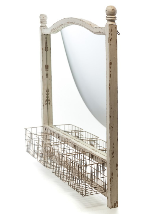 Wyjątkowe, lustro vintage w drewnianej ramie z metalowymi koszykami marki ALURO. Wykonane ręcznie z wyjątkową dbałością o szczegóły. Bielone drewno postarzane specjalną techniką z praktycznymi koszykami w stylu retro, to absolutny strzał w dziesiątkę. To prowansalskie lustro jest duże i pięknie powiększy optycznie przestrzeń. Ozdobne, toczone wykończenia nadają mu romantycznego wyglądu. Odnajdzie się we wnętrzach w stylu prowansalskim i country, a także innych, oryginalnych stylizacjach.