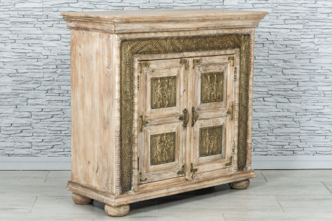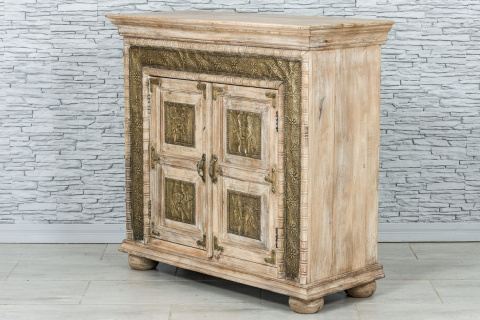 Mała, drewniana komoda indyjska z dekoracyjnym, mosiężnym frontem.