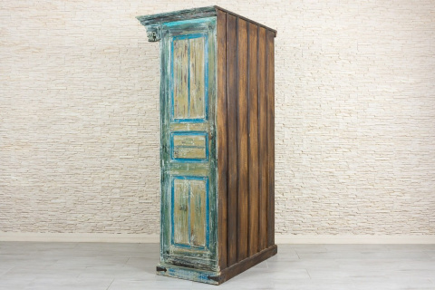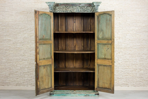 Powierzchnia szafy została specjalnie postarzona i przetarta, dzięki czemu spod kolejnych warstw wyłaniają się niebieskości, turkusy i zielenie. Szafa ze starymi, oryginalnymi indyjskimi drzwiami, posiadają ozdobny skobel, który nadaje meblowi charakteru vintage. Mebel odnajdzie się w każdym pomieszczeniu. Polecamy do przestronnych, wysokich wnętrz. Wewnątrz szafy znajdują się pojemne półki.