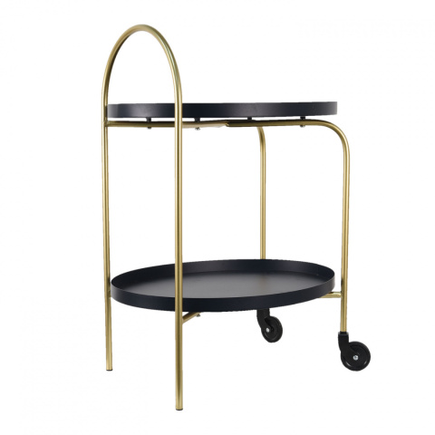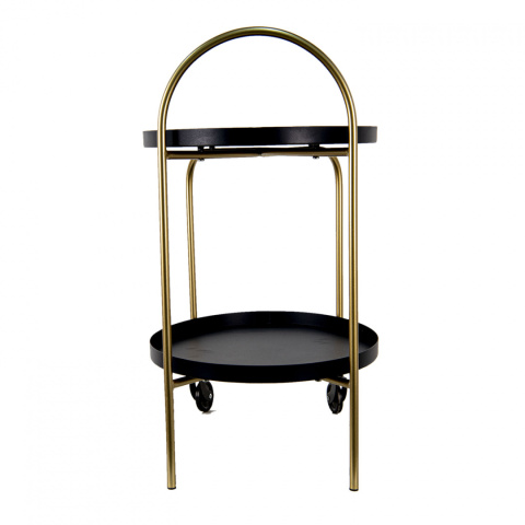 Ten wyjątkowy barek posiada dwie półki tace oraz kółka, dzięki czemu możesz z łatwością zmieniać jego położenie i używać w zależności od potrzeb. Ten designerski stolik pomalowano proszkowo na odcień czarnego matu i połyskującego złota. Będzie świetnie wyglądał w rogu Twojego salonu lub jadalni. Dolna półka doskonale sprawdzi się jako miejsce na ulubione trunki, a wygodny blat pozwoli Ci przygotować drinki na domowej imprezie. Możesz również postawić na nim świeże kwiaty czy też rośliny doniczkowe lub wykorzystać go jako miejsce na inne dekoracje.