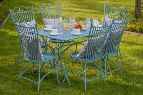Stół wykonany z metalu, z licznymi rustykalnymi przetarciami. Zmieścisz przy nim gości, a przede wszystkim poczujesz się jak w słonecznej Prowansji. To piękny, a zarazem funkcjonalny mebel do Twojego ogrodu, który zachwyca designem i jakością wykonania.