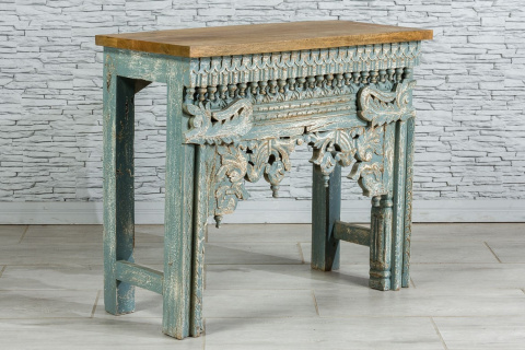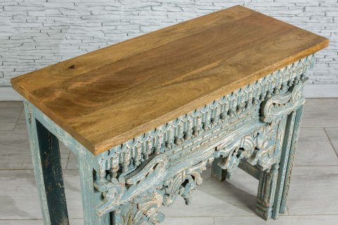 Miętowa, drewniana konsola indyjska z przetarciami, wykonana w całości z drewna mango. Mebel wyjątkowo strojny i dekoracyjny. Gęsto rzeźbiony. trójwymiarowy front robi niezwykłe wrażenie dodaje konsoli uroku. Blat w naturalnym odcieniu mango tworzy przepiękny kontrast do intensywnej całości.