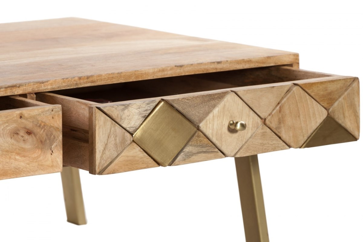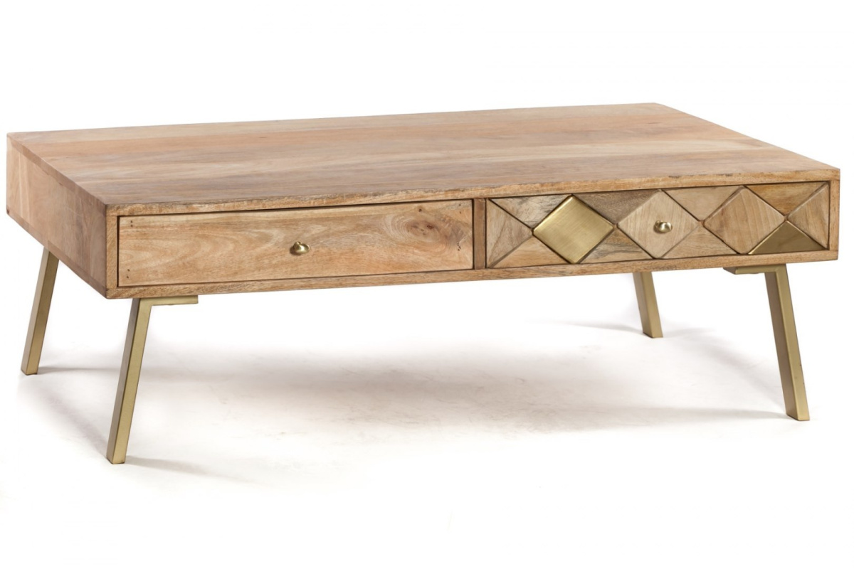 Prostokątny stolik kawowy marki ALURO, wykonany z połączenia drewna, mosiądzu i żelaza, mebel oryginalny, unikatowy, ręcznie wyprodukowany w manufakturze indyjskiej. Model ARATI, to mebel utrzymany w naturalnej strukturze i kolorze drewna mango. Elementem ozdobnym, umieszczonym we frontowej części jest drewniana mozaika oraz wstawki z platerowanego mosiądzu. Stolik posiada dwie szufladki z ozdobnymi uchwytami. Blat oparty został na metalowych nogach w kolorze antycznego mosiądzu,. Ten oryginalny stolik kawowy nada Twojemu wnętrzu stylu i oryginalnego charakteru.