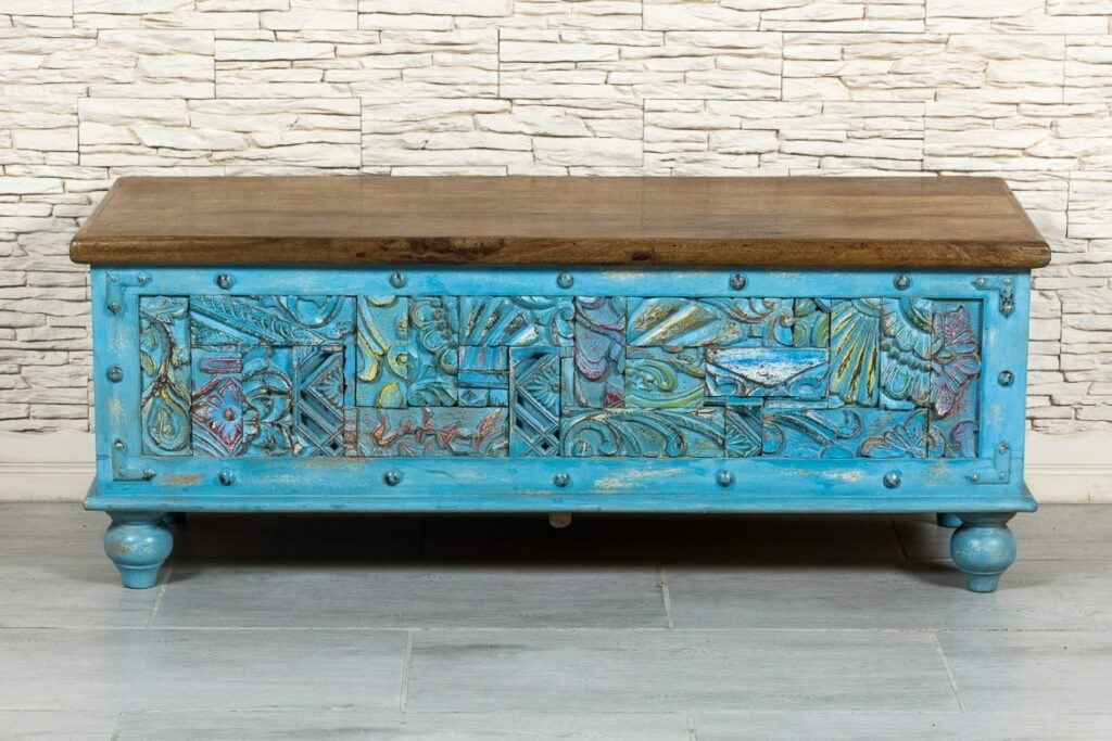 Niebieska drewniana skrzynia indyjska z ozdobnym frontem