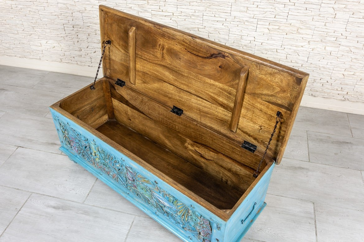 Wyjątkowy drewniany niebieski kufer indyjski, z bogato zdobionym frontem, wykonany ręcznie z drewna mango. Może służyć jako siedzisko lub schowek. Skrzynia posiada masywną, solidną konstrukcję., jest więc trwała i odporna na zniszczenia. Wieko w pięknym, naturalnym kolorze drewna zestawiono z intensywnym odcieniem niebieskości. Na florystycznych rzeźbieniach przebijają wszystkie kolory tęczy. Całość delikatnie postarzona i przecierana. Skrzynia odnajdzie się w przedpokoju, a także salonie czy sypialni.