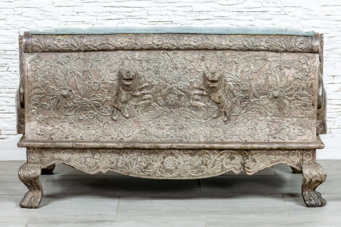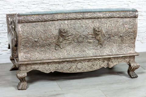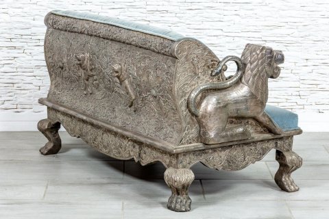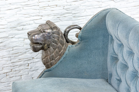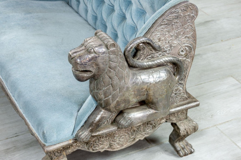 Luksusowa mini sofa indyjska, wykonana ręcznie w małej manufakturze. Zbudowana na masywnym, tekowym stelażu i pokryta srebrną blachą próby 900+, srebro jest naturalnie spatynowane. Kształtem i stylem nawiązuje do mebli antycznych. Usytuowana na lwich nogach i ozdobiona dwoma lwami po bokach. Całość bogato rzeźbiona, niezwykle strojna i wytworna. Ciężki charakter mebla zmiękcza przepiękny odcień bladego błękitu. Tapicerkę wykonano z wysokiej jakości weluru, a plecy przepikowano, co dodaje meblowi jeszcze więcej elegancji.