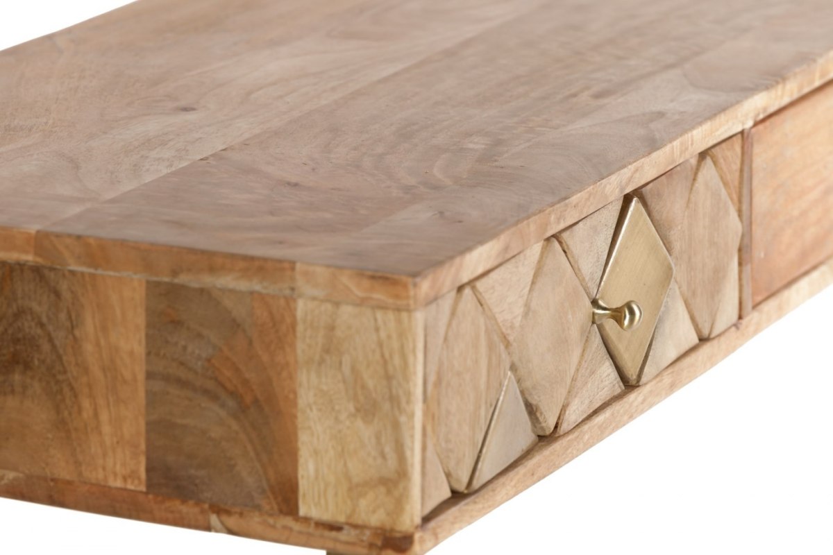 Konsola ARATI marki ALURO, to mebel wykonany z drewna mango, utrzymanego w naturalnej strukturze i kolorze. Elementem ozdobnym,umieszczonym we frontowej części, są kawałki drewna połączone w mozaikę, oraz wstawki z platerowanego mosiądzu. Konsola została wsparta na metalowych nogach w kolorze antycznego mosiądzu.