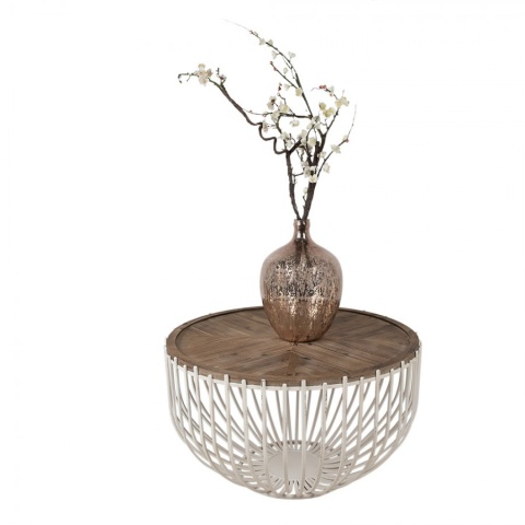 Designerski, industrialny stolik kawowy z drewnianym blatem od Clayre & Eef. Podstawa stolika wykonana jest z metalowych, wygiętych prętów które celowo postarzono i przetarto. Stolik wybarwiono na odcień antycznej bieli, która bardzo ładnie komponuje się z brązowym blatem. Ten wyjątkowy mebel odnajdzie się zarówno we wnętrzu skandynawskim jak i loftowym czy też country.