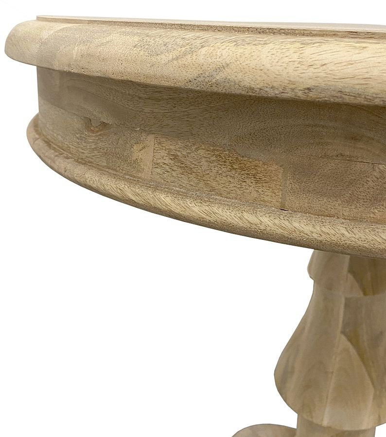 Okrągły jasny stolik drewniany z Indii na ozdobnej nodze