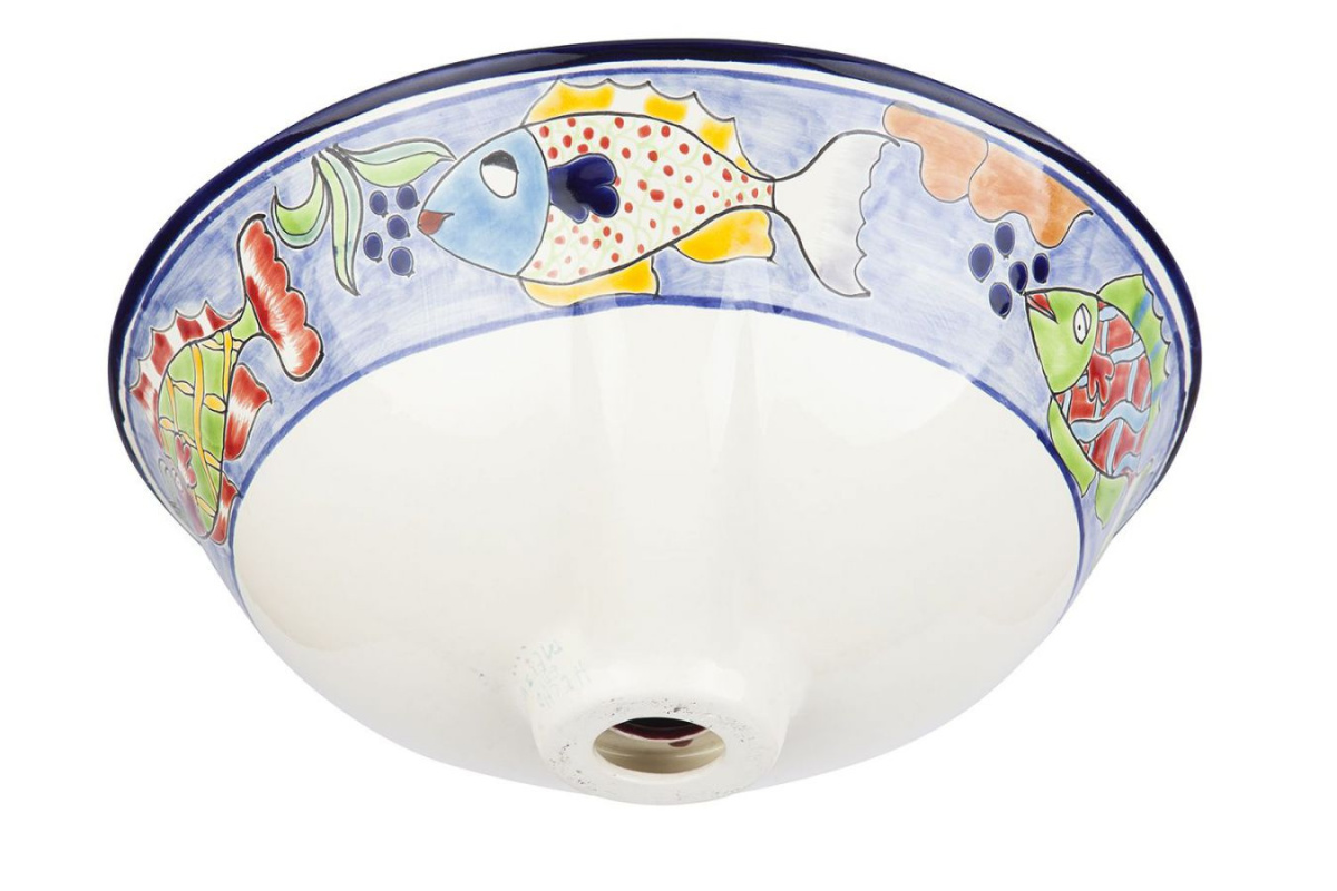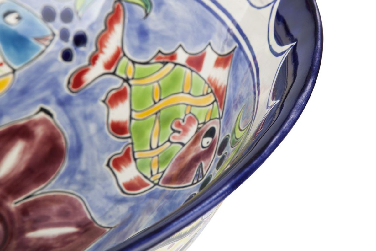 Ta kolorowa, ręcznie malowana umywalka, posiada wzory w środku i na zewnątrz. Piękna, oryginalna umywalka z motywem kolorowych ryb. Misa może być częściowo wpuszczona w blat, co daje niebanalny efekt wizualny. Wszystkie umywalki są malowane ręcznie przez meksykańskiego artystę, więc każda umywalka stanowi unikalne dzieło sztuki użytkowej.