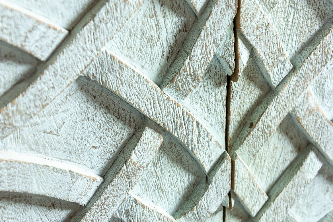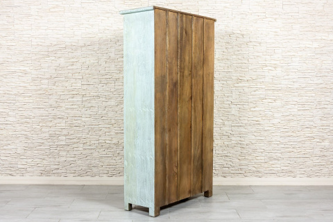 Drewniana szafa indyjska z ozdobnymi, ażurowymi frontami, na których wyrzeźbiono zjawiskowe, florystyczne wzory. Ten mebel został wykonany ręcznie w Indiach w małej manufakturze. Do jego produkcji użyto drewna mango, które wypiaskowano i pomalowano na odcień bladej mięty wpadającej w pistację. Dzięki temu szafa ma ciekawą fakturę, która pięknie komponuje się z delikatnymi przetarciami. Oprócz walorów estetycznych szafa jest również bardzo praktyczna. Posiada aż 4 pojemne półki.