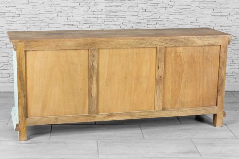 Komodę wykonano w małej, indyjskiej manufakturze z egzotycznego drewna mango. Powierzchnia drewna została pomalowana na odcień lodowego błękitu i postarzona. Orientalny, rzeźbiony front z przepięknymi mandalami idealnie pasuje do pastelowego koloru i przetarć.