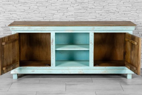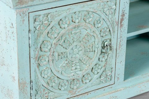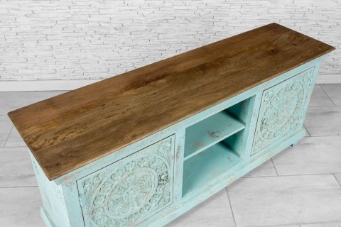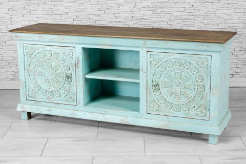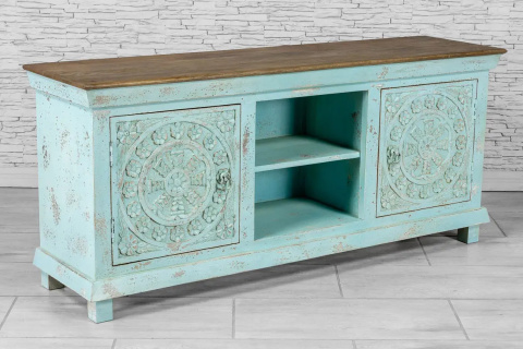 Indyjska, postarzana niebieska szafka RTV w stylu orientalnym.