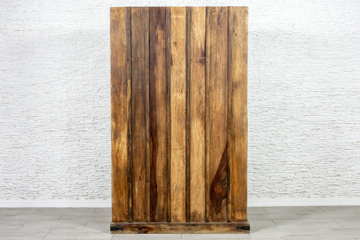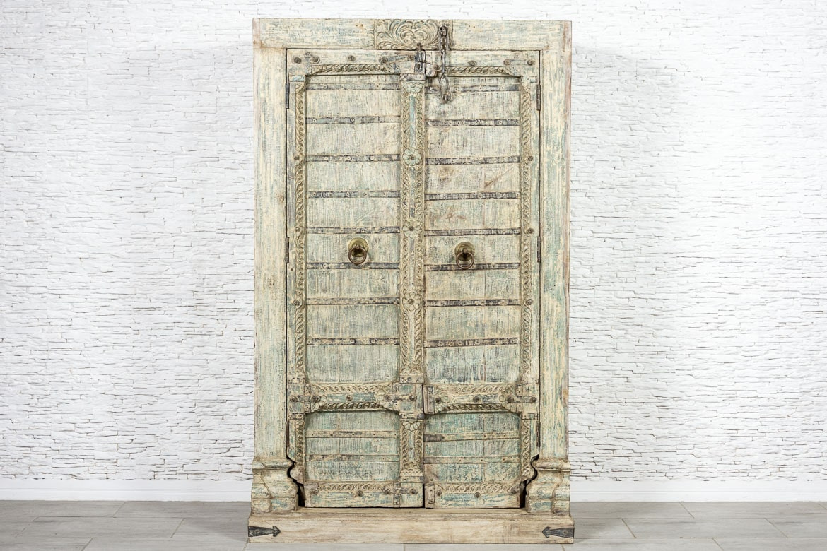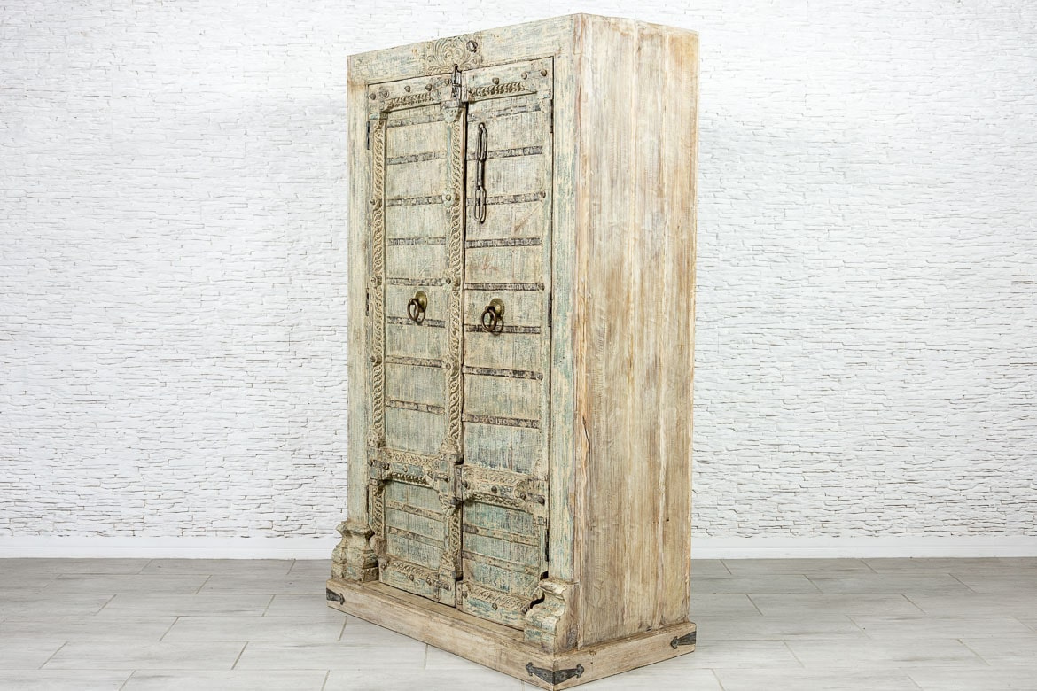 Duża masywna szafa indyjska w stylu antycznym. Wykonano ją w małej manufakturze indyjskiej, z litego drewna tekowego i mango. Stare, antyczne ozdobne fronty o nierównej fakturze, zachwycają ręcznym rzeźbieniem i niezwykłym odcieniem antycznego beżu wpadającego w szarość. Mebel przecierany i delikatnie postarzony. Rustykalne okucia i mosiężne dodatki są wspaniałym dopełnieniem wysmakowanej całości.