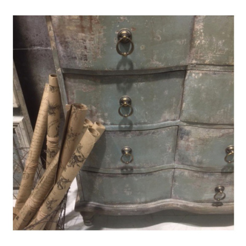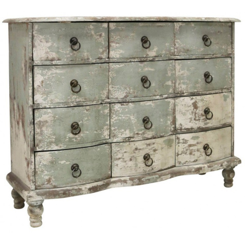 Postarzana drewniana komoda z szufladami marki Chic Antique. Ta piękna komoda na ozdobnych nóżkach, to mebel stworzony do wysmakowanych wnętrz rustykalnych. Swój wyjątkowy wygląd zawdzięcza efektowi postarzenia. Bruzdy, odpryski i przecierki, sprawiają, że wygląda jak z zabytkowego domu. Komoda posiada dwanaście szuflad z uchwytami w stylu retro. Mebel sprawdzi się w każdym pomieszczeniu. Ozdobi zarówno stylową sypialnię jak również prowansalski salon czy przedpokój.