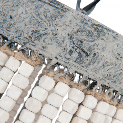 Lampa wykonana z metalu i drewna, które dodają jej charakteru vintage. Postarzana metalowa lampa z drewnianymi koralikami – doda uroku i nostalgii do Twojego wnętrza. Ta unikalna lampa to idealne połączenie rustykalnego stylu z retro akcentami. Wykonana z metalu i ozdobiona urokliwymi drewnianymi koralikami, ta lampa wzbogaci każde pomieszczenie swoim niepowtarzalnym designem. Drewniane koraliki połączone są ze sobą metalowymi, postarzanymi obręczami.