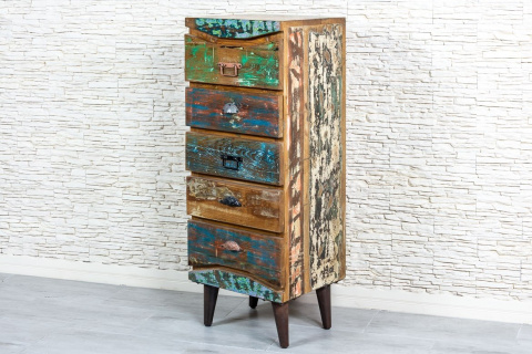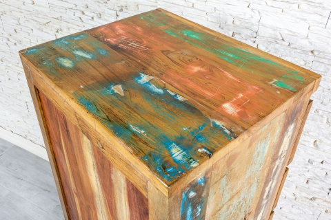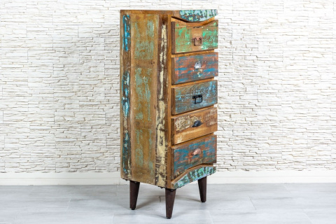 Komoda w całości wykonana z drewna, szczotkowana i przecierana. Wybarwiona na różne kolory. Mebel został dodatkowo ozdobiony dekoracyjnymi uchwytami - przy każdej szufladzie zamontowano inny. Całość zachowana w klimacie vintage. Komoda o uniwersalnym zastosowaniu, sprawdzi się w każdym pomieszczeniu. posiada pięć szuflad.