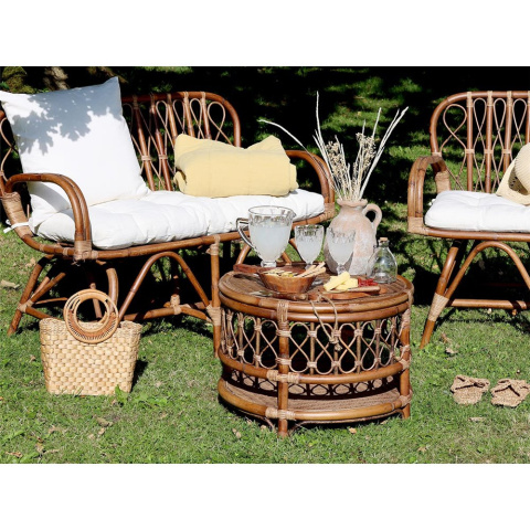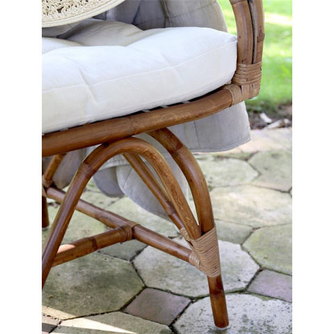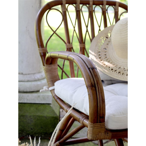 Rattanowy fotel z poduchą z serii ANOR marki Chic Antique. Wykonany z giętego rattanu i wykończony jasną, miękką poduchą, wiązaną na troczki.