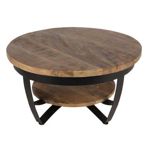 Okrągły, designerski stolik loftowy marki Clayre & Eef wykonany ze szczotkowanego drewna i metalu. Gruby blat w naturalnym odcieniu przepięknie komponuje się z czarnym, matowym odcieniem stelaża. dolna półka sprawia, że mebel jest jeszcze bardziej ciekawy wizualnie, a także daje możliwość przechowywania akcesoriów RTV lub np. gier planszowych. Polecamy do stylizacji loft/industrial lub skandynawskich.