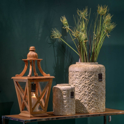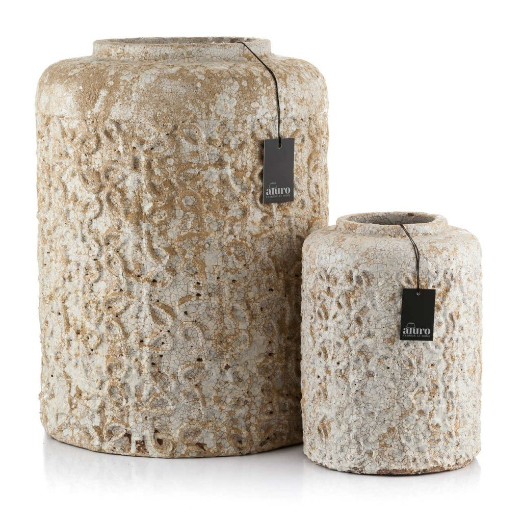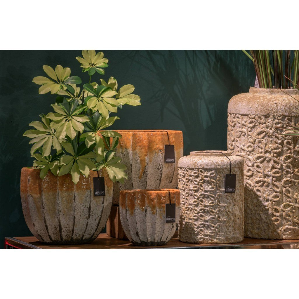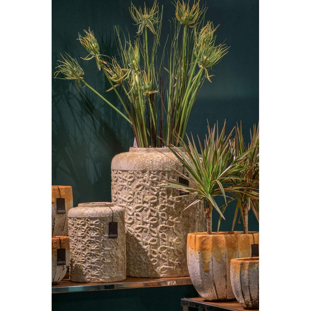 Stylowa, bardzo duża donica betonowa CASCARA XL marki ALURO. Nierówna, porowata, przypominająca antyczne naczynie wykopane z ruin. Może być zarówno osłoną na kwiat jak i wazonem. Idealna zarówno do bukietów świeżych i suszonych. Polecamy łączyć z mniejszym rozmiarem z tej serii.