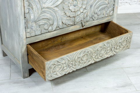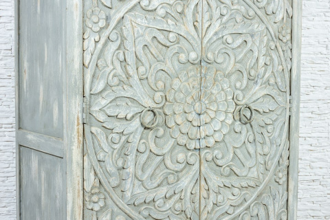Wysoka, orientalna, postarzana szafa dwudrzwiowa z dekoracyjnym frontem wyrzeźbionym na bazie kształtu mandali. Ten okazały mebel został wykonany ręcznie przez indyjskich rzemieślników z drewna mango. Powierzchnia została specjalnie postarzona i przetarta, dzięki czemu spod kolejnych warstw wyłaniają się inne odcienie szarości, a niekiedy naturalny kolor drewna. Wewnątrz szafy znajdują się trzy pojemne półki, na dole jedna szeroka szuflada. Ozdobne uchwyty nadają meblowi charakteru vintage. Mebel odnajdzie się w każdym pomieszczeniu. Polecamy do wnętrz inspirowanych orientem.