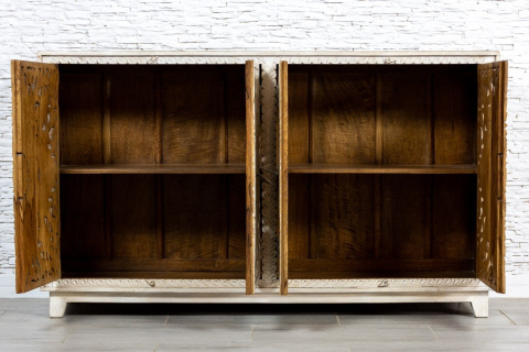 Duża, biała komoda indyjska z drewna mango. Mebel posiada przepiękne, rzeźbione florystycznie, ażurowe fronty, które kryją za sobą pokaźną przestrzeń do przechowywania. Komoda zachwyca zarówno stylem jak i funkcjonalnością. Ozdobi przestronny salon w orientalnym wnętrzu lub hall w indyjskiej restauracji.