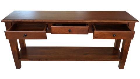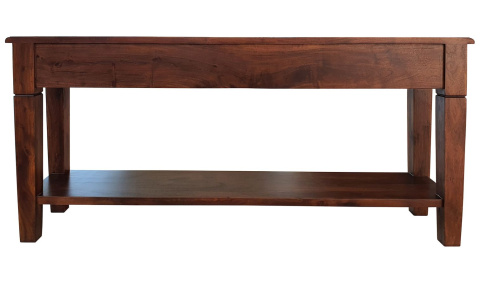 Konsola wykonana ręcznie w Indiach z egzotycznego drewna akacji, o ciepłym brązowym odcieniu. Jej prosta, ponadczasowa konstrukcja sprawia, że mebel odnajdzie się w wielu stylizacjach i będzie użytkową ozdobą wnętrza, szczególnie kolonialnego i klasycznego.