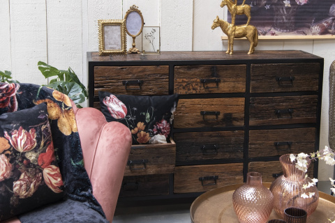 Mebel został wykonany z mocno szczotkowanego, postarzonego drewna i metalu. Komoda , bieliźniarka posiada dwanaście szuflad z minimalistycznymi uchwytami. Jest bardzo funkcjonalna i bez problemu posegregujesz w niej wszelkiego rodzaju przedmioty. Jest dobrym rozwiązaniem do każdego pomieszczenia i tylko od Twojej wyobraźni zależy jej zastosowanie. Komoda sprawdzi się w stylizacjach loft/industrial, country a także skandynawskich.