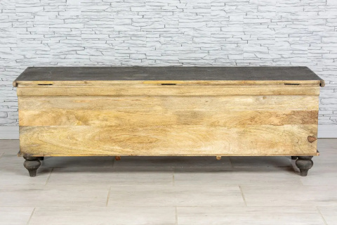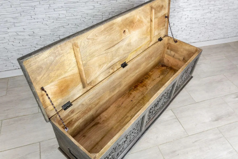Kufer może służyć jako siedzisko i schowek. Jest jednocześnie wyjątkową ozdobą wnętrza. Ta piękna skrzynia, posiada masywną, solidną konstrukcję. Jest więc trwała i odporna na zniszczenia. Wykonana ręcznie w Indiach.