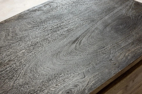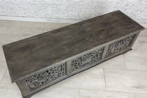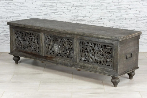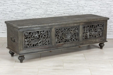 Szeroka, orientalna skrzynia indyjska, wykonana z drewna mango i piaskowana. Posiada przepiękny, ażurowy front z liśćmi i ptakami oraz dużym kwiatem w centralnej części. Całość w odcieniu grafitowym, z widocznym usłojeniem.