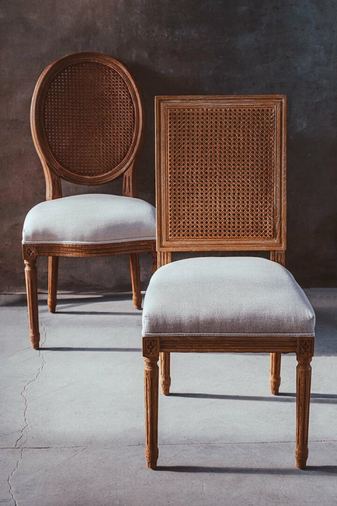 Krzesło wykonane z dębu szczotkowanego, bielonego, oparcie wykonane z naturalnego rattanu, siedzisko obite wysokiej klasy lnianą tapicerką w odcieniu beżowym. Przepiękny, klasyczny kształt inspirowany meblami z dawnych lat, oddaje hołd ponadczasowej elegancji muśniętej współczesnością.
