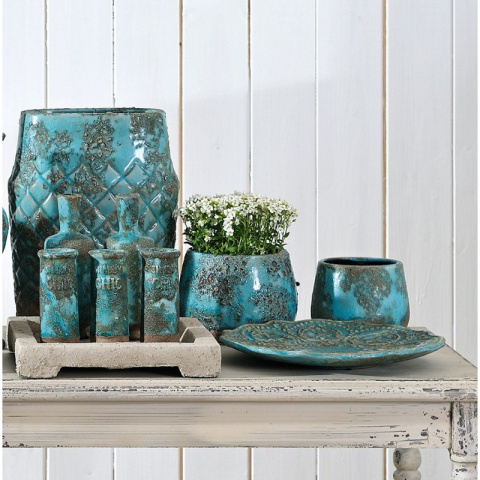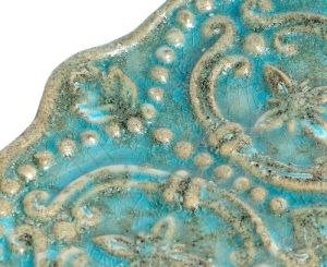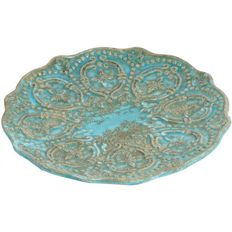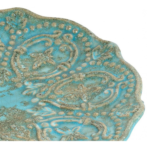 Ten postarzany talerz to wspaniała dekoracja do wysmakowanego wnętrza. Talerz wykonany jest z wysokiej jakości ceramiki w turkusowym odcieniu, z pięknymi rzeźbieniami.
