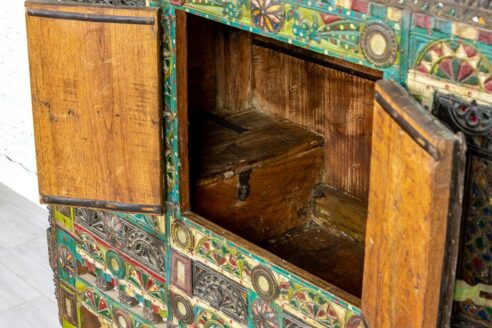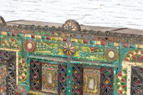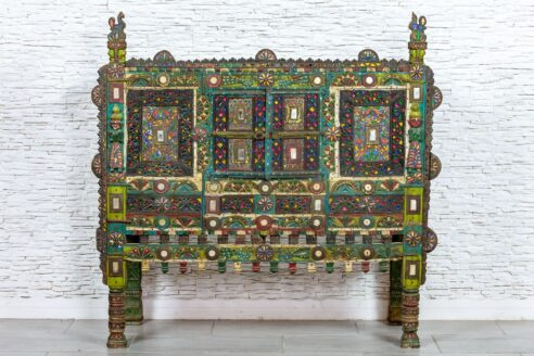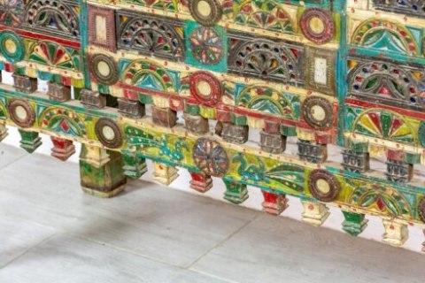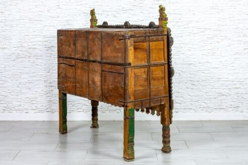 Zjawiskowa, unikalna damchia tybetańska, ozdobna mieniąca się różnymi kolorami. Wykonana ręcznie, w całości z drewna tekowego. Komoda posiada wewnętrzną skrytkę. Ten niezwykły, zabytkowy mebel dekoracyjny zachwyci miłośników orientu.