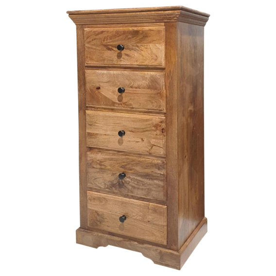 Ten wyjątkowy mebel został wykonany w Indiach z wysokiej jakości litego drewna mangowca indyjskiego, wybarwiono na kolor toffi i wykończono lakierem satynowym. Komoda posiada pięć pojemnych szuflad. Przymocowano do nich stylowe uchwyty, które ułatwiają otwieranie i są jednocześnie ozdobą. Mebel idealny do stylowych, klasycznych wnętrz i aranżacji kolonialnych. Łączy w sobie funkcjonalność i dobry styl.