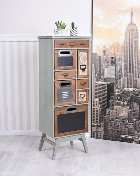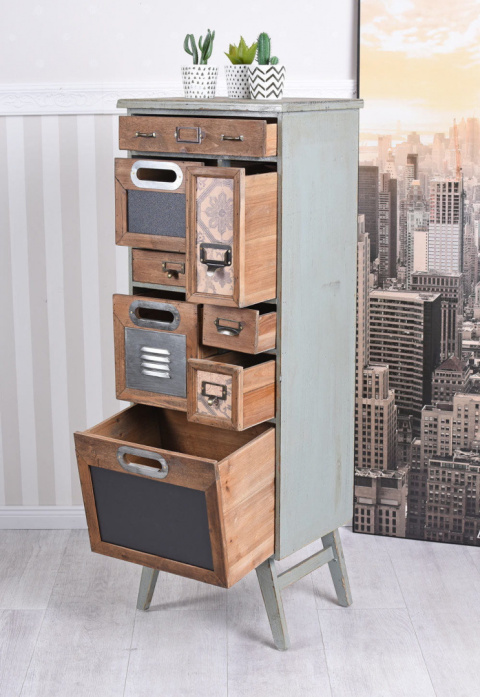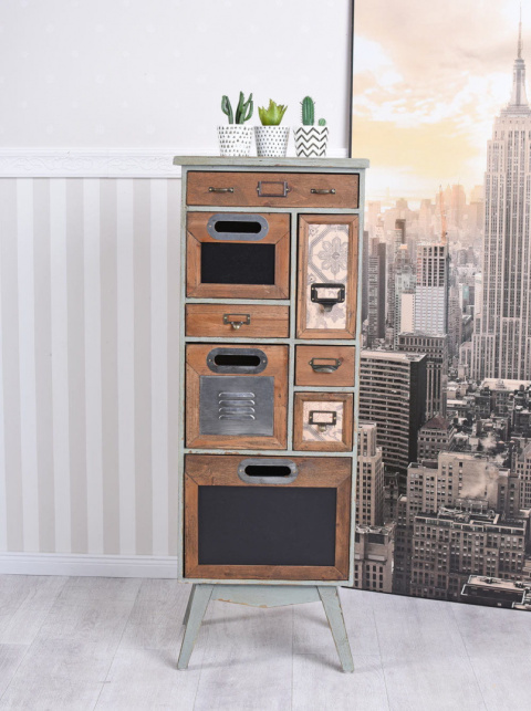 Wąska, wysoka komoda z szufladami w stylu loftowym.