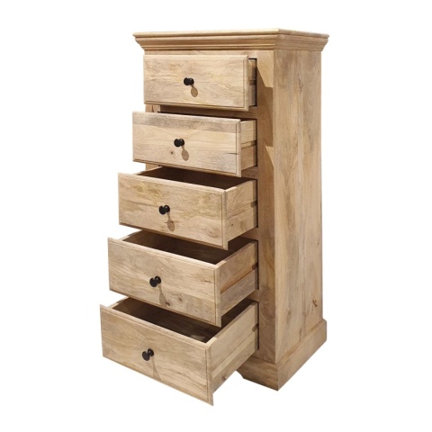 Ten mebel został wykonany w Indiach, a do jego produkcji użyto wysokiej jakości litego drewna mangowca indyjskiego w jego naturalnym kolorze i wykończono wodnym lakierem matowym. Komoda posiada pięć pojemnych szuflad. Przymocowano do nich stylowe uchwyty, które ułatwiają otwieranie i są jednocześnie ozdobą. Mebel idealny do stylowych, klasycznych wnętrz i aranżacji kolonialnych. Łączy w sobie funkcjonalność i dobry styl.