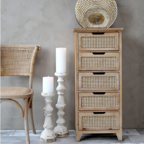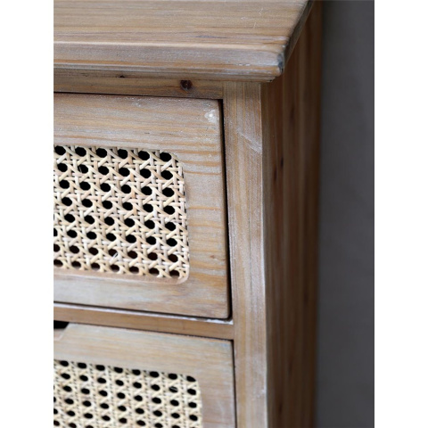Wąska, drewniana komoda słupek z rattanowymi frontami.